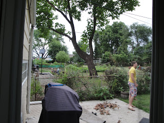 When we moved in, our side yard was crazy overgrown, and other than keeping our side trimmed at the fence, there wasn't really anything we could do about it. Our neighbors, whose overgrown bushes were encroaching into our yard, always somewhat sheepishly said that they were trying their best to get everything fixed up, but it would take time. We bought the house with the yard looking the way it did in the picture above, so we knew it may never get any better, but had hope. Over the 6-9 months, the neighbors have started making improvements to their house, replacing windows, exterior doors, redoing their breezeway, kitchen and bathroom (so we have been told), and most recently, started to tackle the back yard. We don't talk to the neighbors that often, as their back yard got even worse this year - to the point we couldn't even really see into their yard!A couple of weeks ago, Joe and I woke up to the sound of chainsaws humming. When we looked outside, we noticed these neighbors had a tree trimming service working in their front yard, taking a tree out. We crossed our fingers that they'd get to the back yard, and a few hours later, I discovered the workers starting to cut down a tree that was growing over the fence and brushing our roof, directly over the power lines to our house! I was so excited I was almost stunned, and sat watching as a few workers continued to take their heavy duty chainsaws to the bushes along the fence line. Although I would have really enjoyed watching this continue, I had to go to work. That night, we returned home to find that a good portion of the bushes along the fence had been cut way back, and a few trees that hung over our property were gone. While we were excited about the developments, we quickly came to the realization that now we could look into their yard, and the sight wasn't any better than the green, leafy 8' privacy fence we'd actually come to enjoy somewhat.