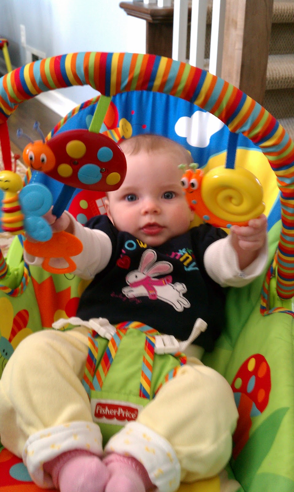Just recently, Madeline has started to be able to grab the toys on the rocking chair, and has figured out how to pull the cord to make the ladybug play its song! Usually Joseph will "help" her play with the toys, so it caught me off guard to hear the song and realize that Joseph wasn't in the same room. Maddie's getting so big!